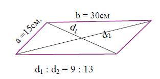 Найдите диагонали параллелограмма ,если их длина относиться как 9:13,а стороны параллелограмма равны 15 см и 30см