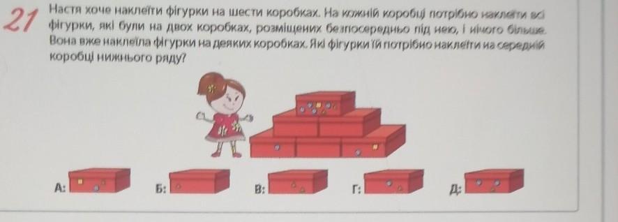 21 Настя хоче наклеїти фігурки на шести коробках. На кожній коробці потрібно наклеїти всі Вона вже наклеїла фігурки на деяких коробках. Які фігурки ïй потрiбно наклести на середній коробцi нижнього ряду?