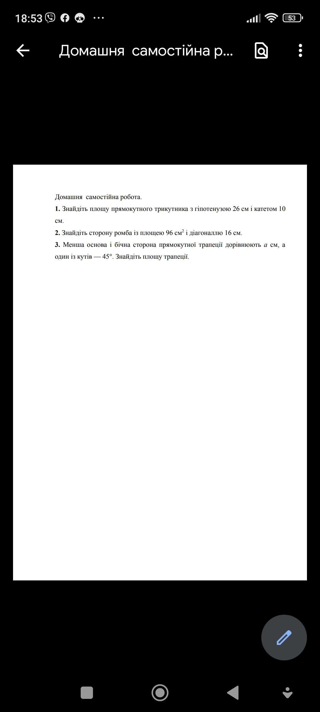 Відповідь: 1 завдання у прямокутного триугольника площу найти можно умножив катет на гипотенузу и поделив на пополам тоесть 26*10=260 и 260:2=130