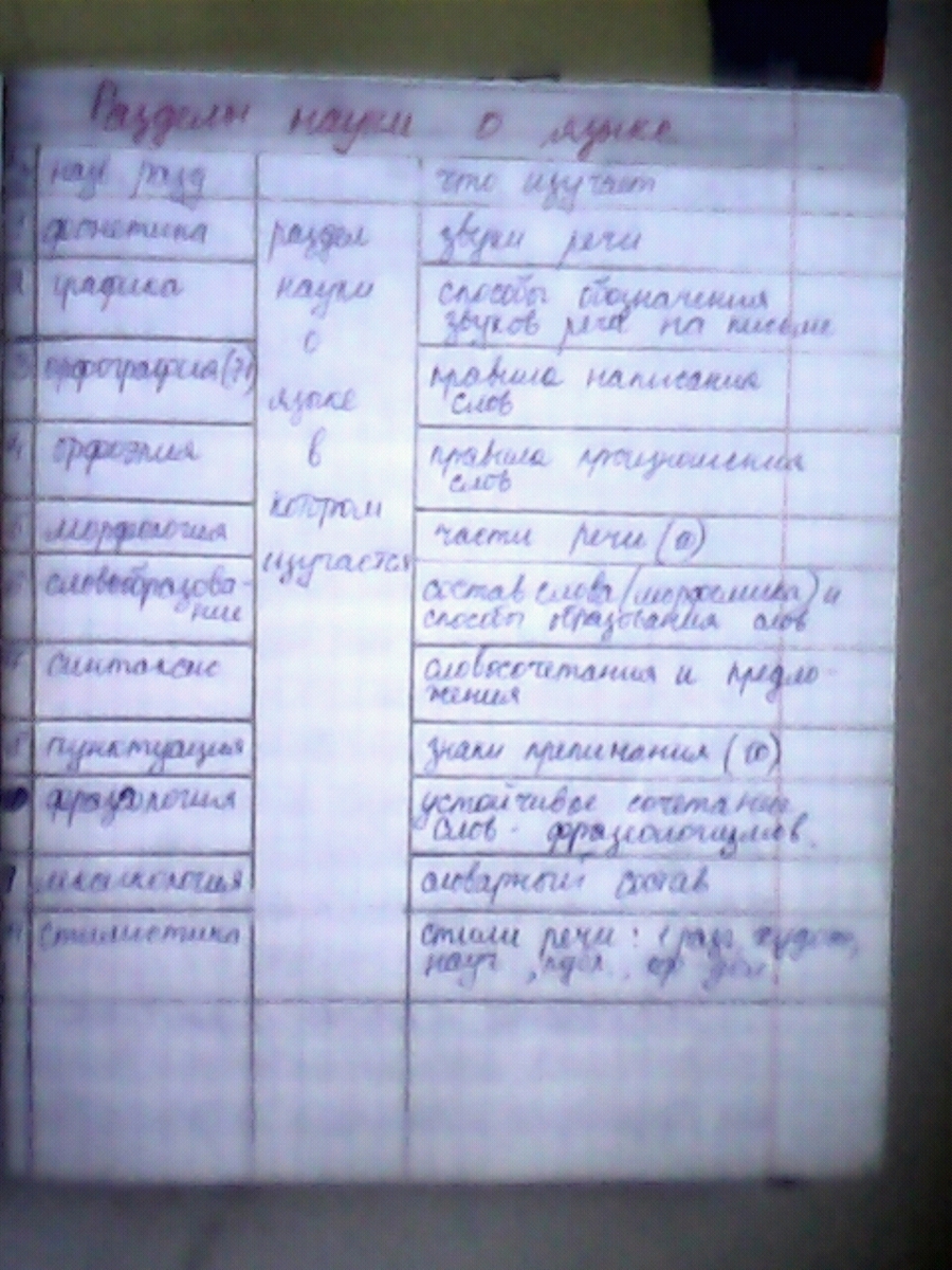 фонетика - раздел науки о языка изучает звуки речи, графика - способы обозначения звуков речи на письме, орфография - правила написания слов (всего 71 орфограмма), орфоэпия - правила произношения слов, морфология части речи(10:сущ.,прил.,числит.,глагол, местоим.,наречие,союз,предлог, частица, междометие), синтаксис - словосочтания и предложения, пунктуация - знаки препинания(10 это . , ! ? : ; - ... скобки и дефис), лексикология - словарный состав языка _ лексику