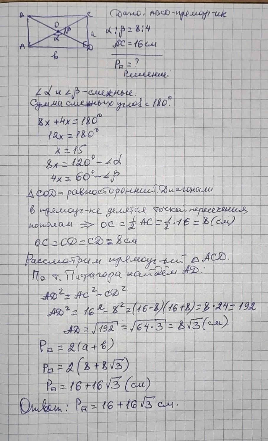 Діагоналі прямокутника утворюють кути, що відносяться, як 8:4. одна з діагоналей дорівнює 16 см знайти периметр прямокутника