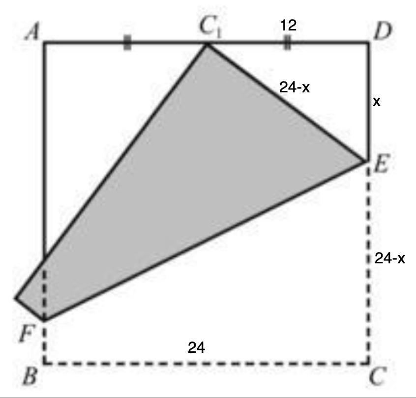 Квадратный лист бумаги ABCD согнули по линии EF так, что точка С попала на середину стороны AD (точка С₁ на рисунке). Найдите длину отрезка DE, если длина стороны листа равна 24. Ответ дайте в сантиметрах.