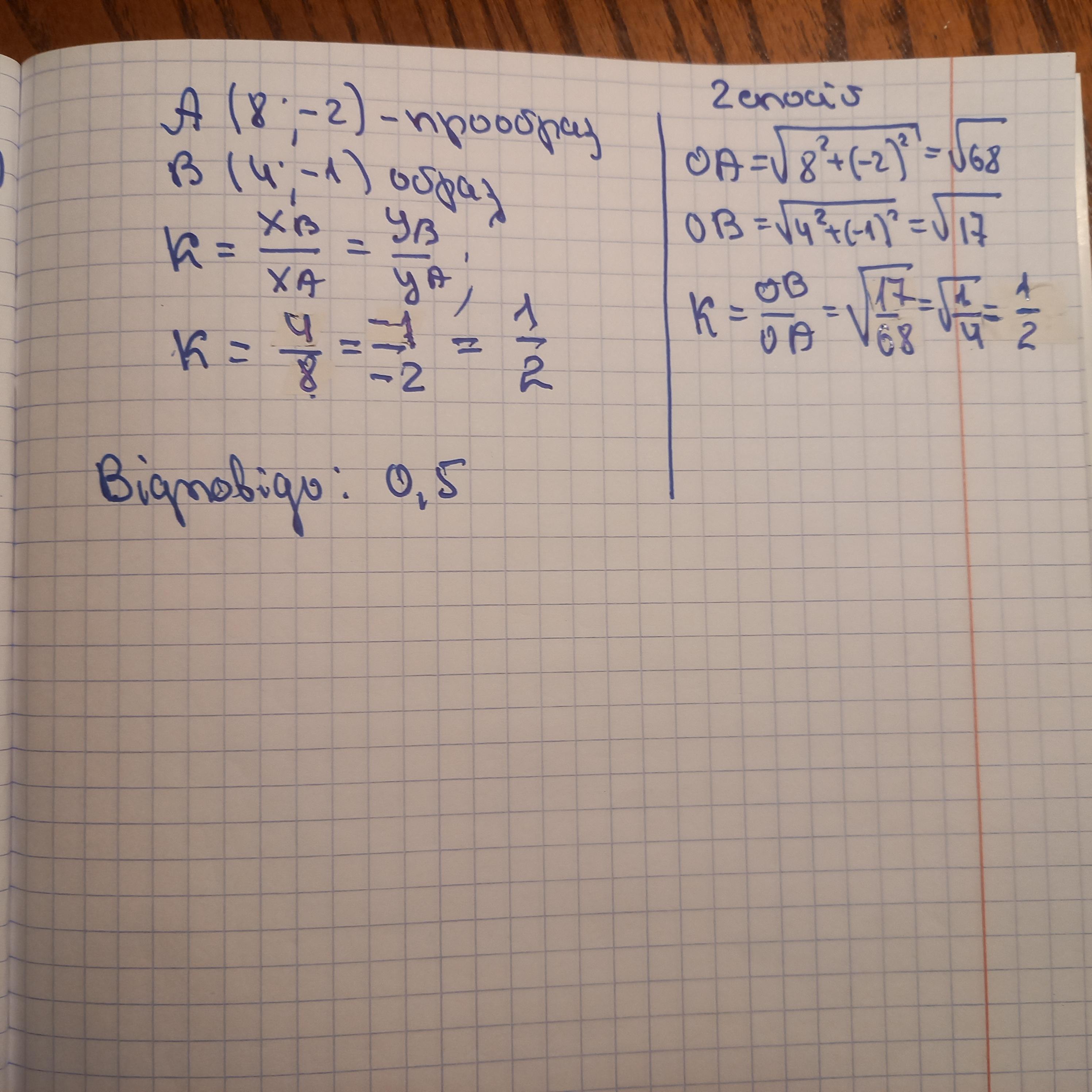 Образом точки А(8;-2) при геометріїіз центром у початку координат є точка В(4;-1). Знайти коефіціент гомотетії.