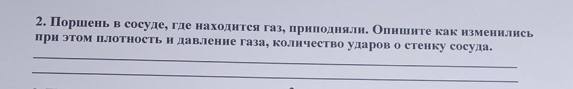 2. Поршень в сосуде, где находится газ, приподняли. Опишите как изменились при этом плотность и давление газа, количество ударов о стенку сосуда.