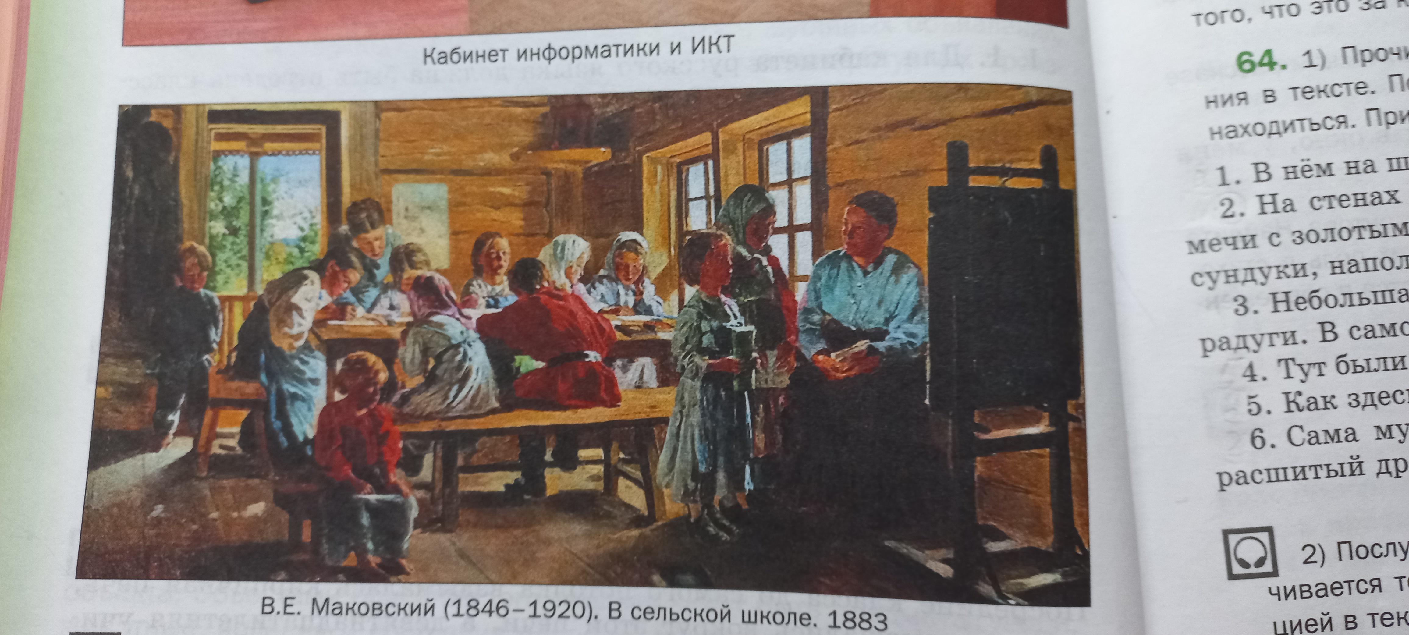 .На картине Владимира Маковского «В сельской школе» изображён один день из жизни учеников и учителей этого учебного заведения. Перед нами просторная комната в деревянной избе. Здесь стоит длинный стол с лавками, два табурета и классная доска.