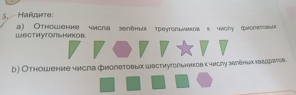 1) зелёных треугольников всего 6 а фиолетовый шестиугольник всего лиш 1 то есть отношение чисел будет 6/1 таким а это равно 6