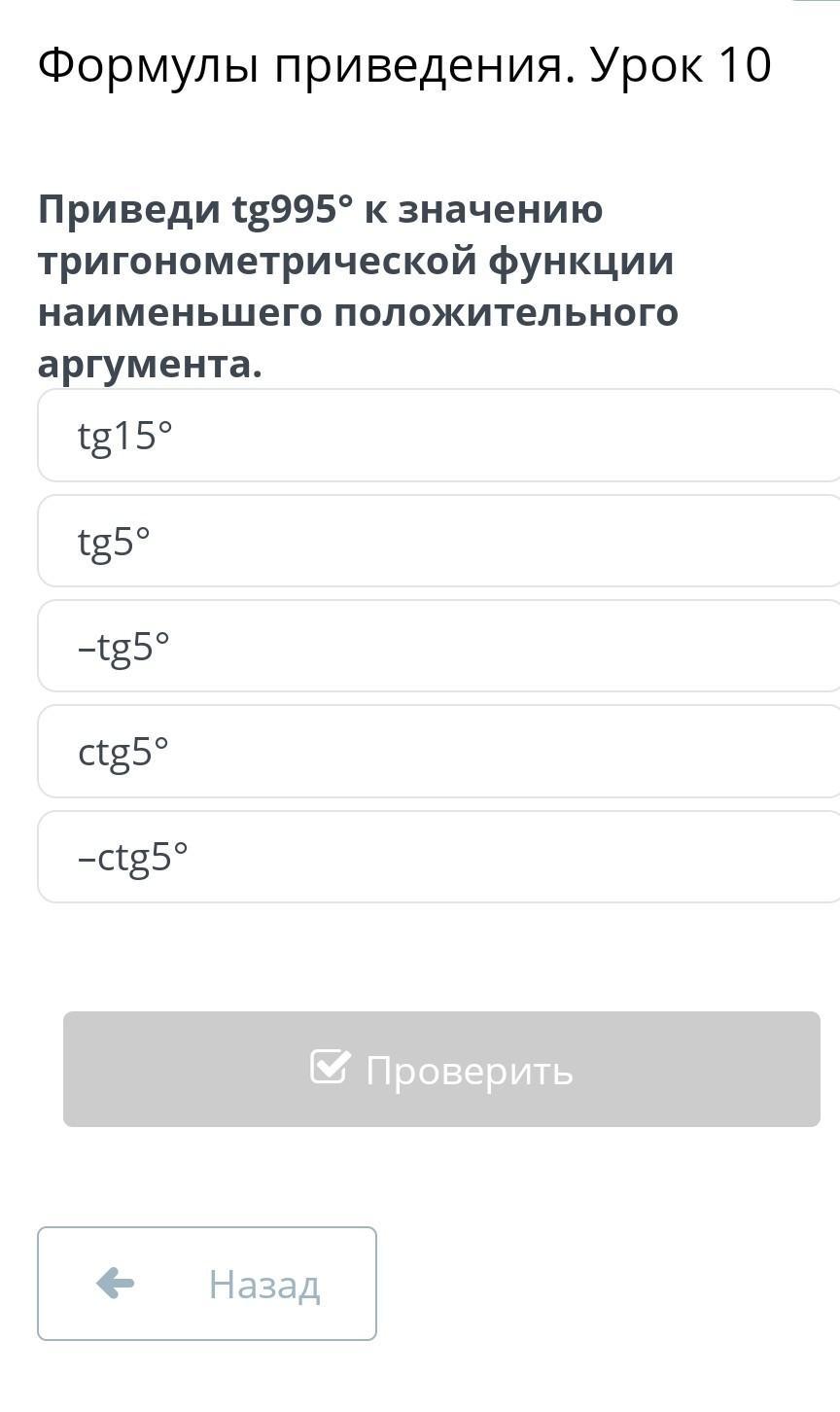Приведи tg995° к значению тригонометрической функции наименьшего положительноГО аргумента. tg15° tg 50 -tg5° ctg5° -ctg5°