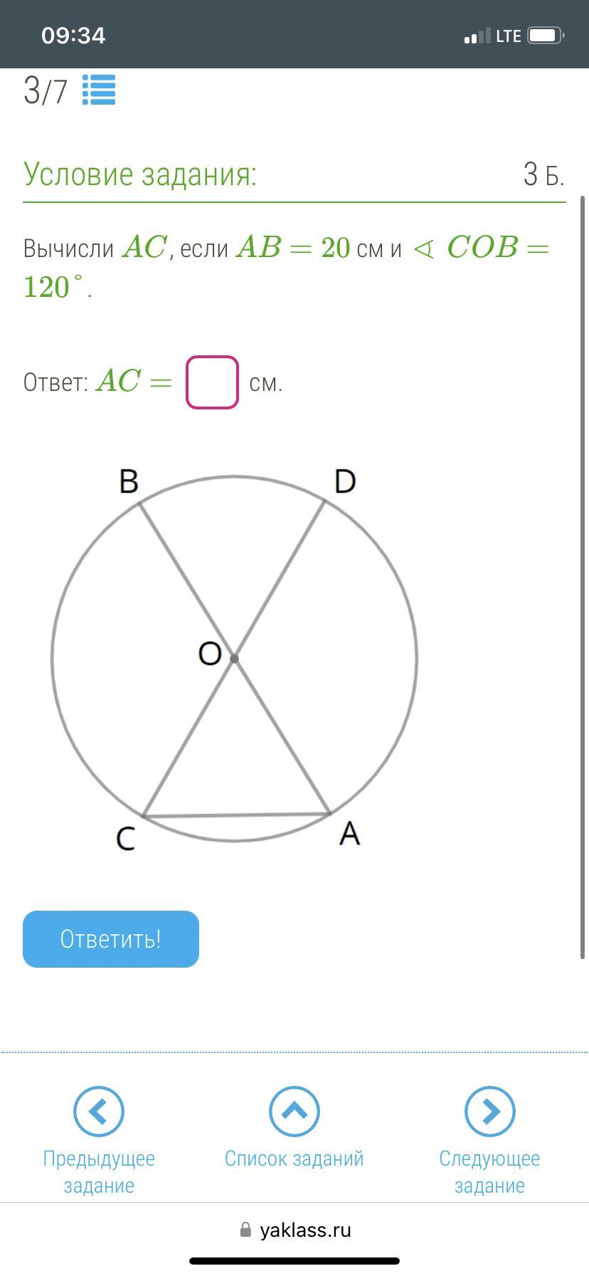 Так як АВ-то діаметр кола→ АС-АВ:2=20см:2=10СМ