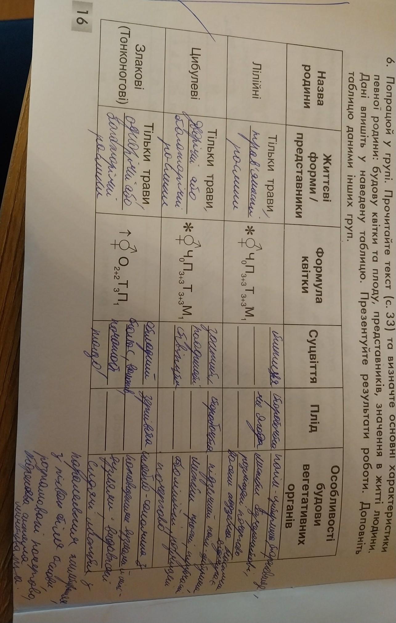6. Попрацюй у групі. Прочитайте текст (с. 33) та визначте основні характеристики певної родини: будову квітки та плоду, представників, значення в житті людини. Дані впишіть у наведену таблицю. Презентуйте результати роботи. Доповніть таблицю даними інших груп.