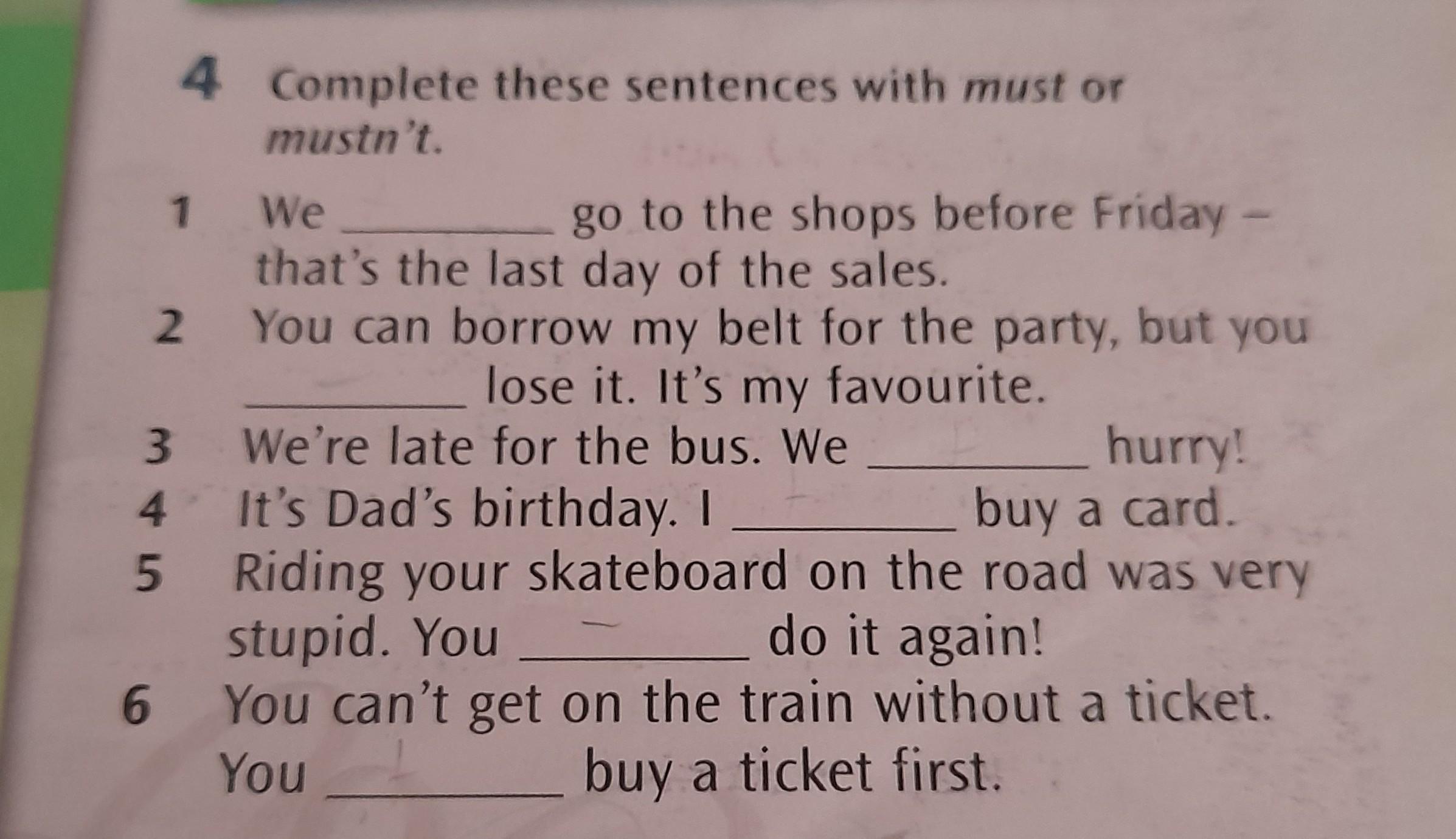 4 Complete these sentences with must or mustn't. 1 2 345 6 We go to the shops before Friday that's the last day of the sales. You can borrow my belt for the party, but you lose it. It's my favourite. We're late for the bus. We It's Dad's birthday. I hurry! buy a card. 5 Riding your skateboard on the road was very do it again! stupid. You You can't get on the train without a ticket. You buy a ticket first.