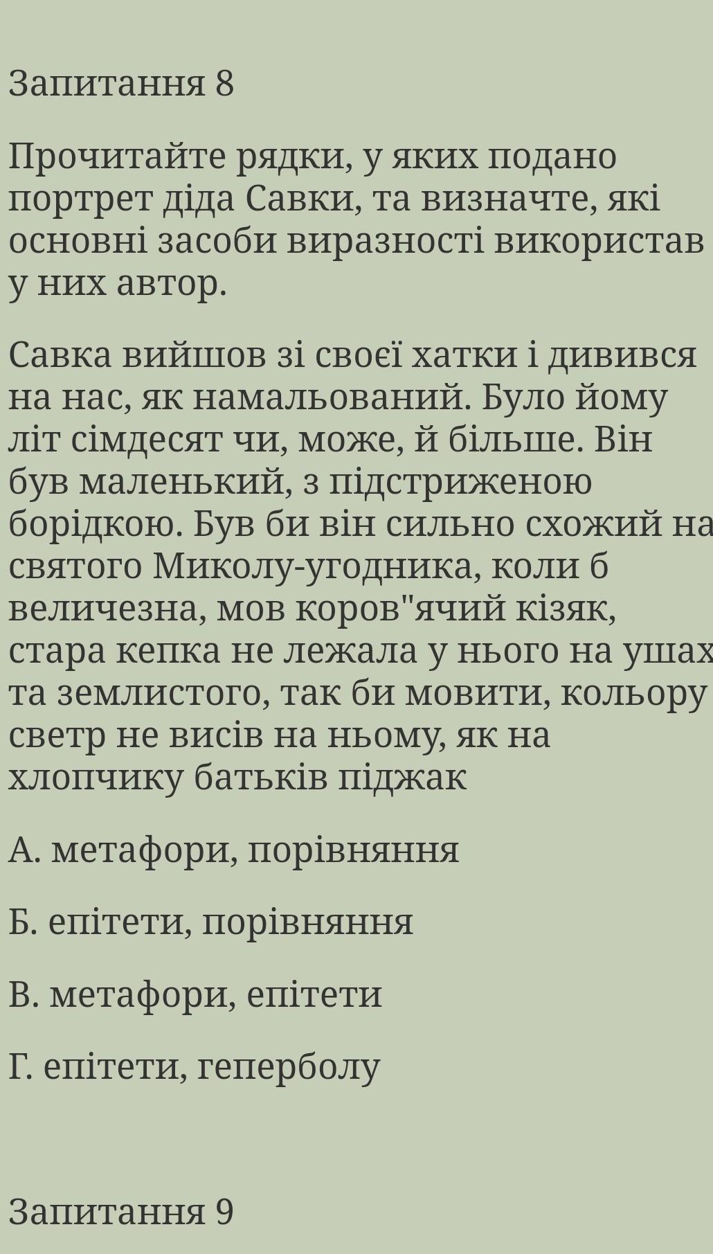 Прочитайте рядки, у яких подано портрет діда Савки, та визначте, які основні засоби виразності використав у них автор. Савка вийшов зі своєї хатки і дивився на нас, як намальований. Було йому літ сімдесят чи, може, й більше. Він був маленький, з підстриженою борідкою. Був би він сильно схожий на святого Миколу-угодника, коли б величезна, мов коров"ячий кізяк, стара кепка не лежала у нього на ушах та землистого, так би мовити, кольору светр не висів на ньому, як на хлопчику батьків піджак