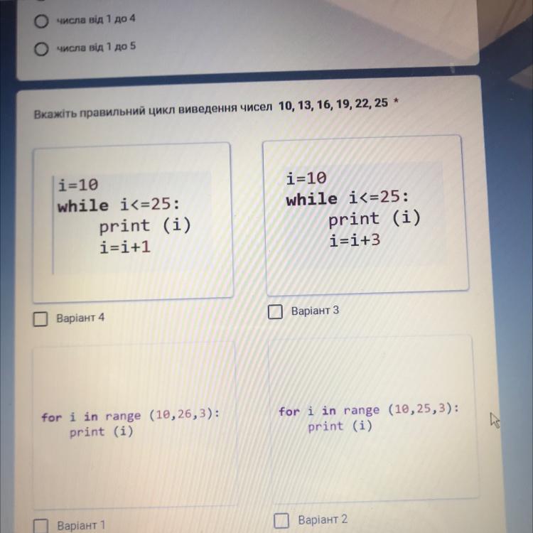 Помогите пожалуйста очень срочно!!!!! Вкажіть правильний цикл виведення чисел 10, 13, 16, 19, 22, 25 *