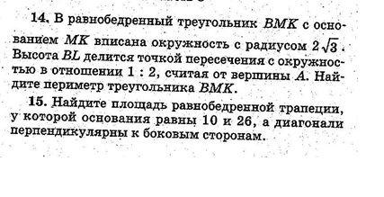 2. поскольку диагонали перпендикулярны боковым сторонам, то окружность, построенная на большом основании как на диаметре, пройдет через концы верхнего основания. Поэтому расстояние от СЕРЕДИНЫ большого основания до вершины малого равно 13, а отрезок, соединяющий середины оснований - это высота, отсюда находим её длину