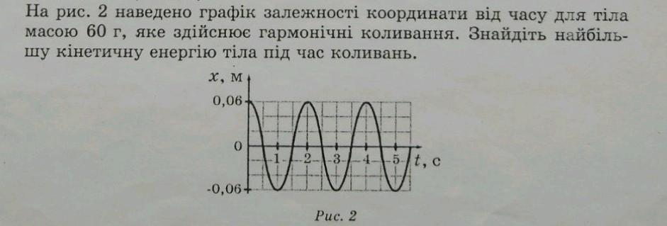 На рис. 2 наведено графік залежності координати від часу для тіла масою 60 г, яке здійснює гармонічні коливання. Знайдіть найбільшу кінетичну енергію тіла під час коливань.