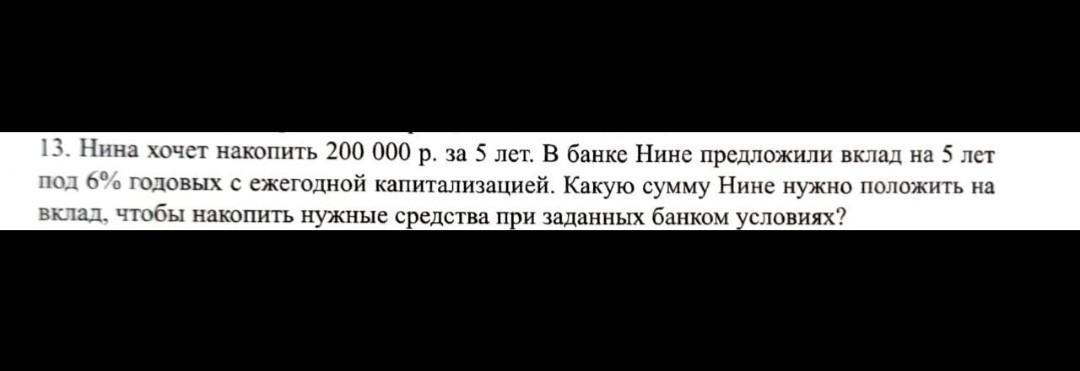Нина хочет накопить 200.000 руб за 5 лет в банке они не предложили вклад на 5 лет под 6% годовых с ежегодной капитализацией какую сумму Нине нужно положить на вклад чтобы накопить нужные средства при заданной банком условиях