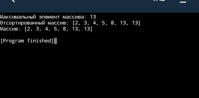 Этот код выводит на экран максимальный элемент массива, отсортированный массив и исходный массив. Надеюсь, это поможет вам выполнить задание.