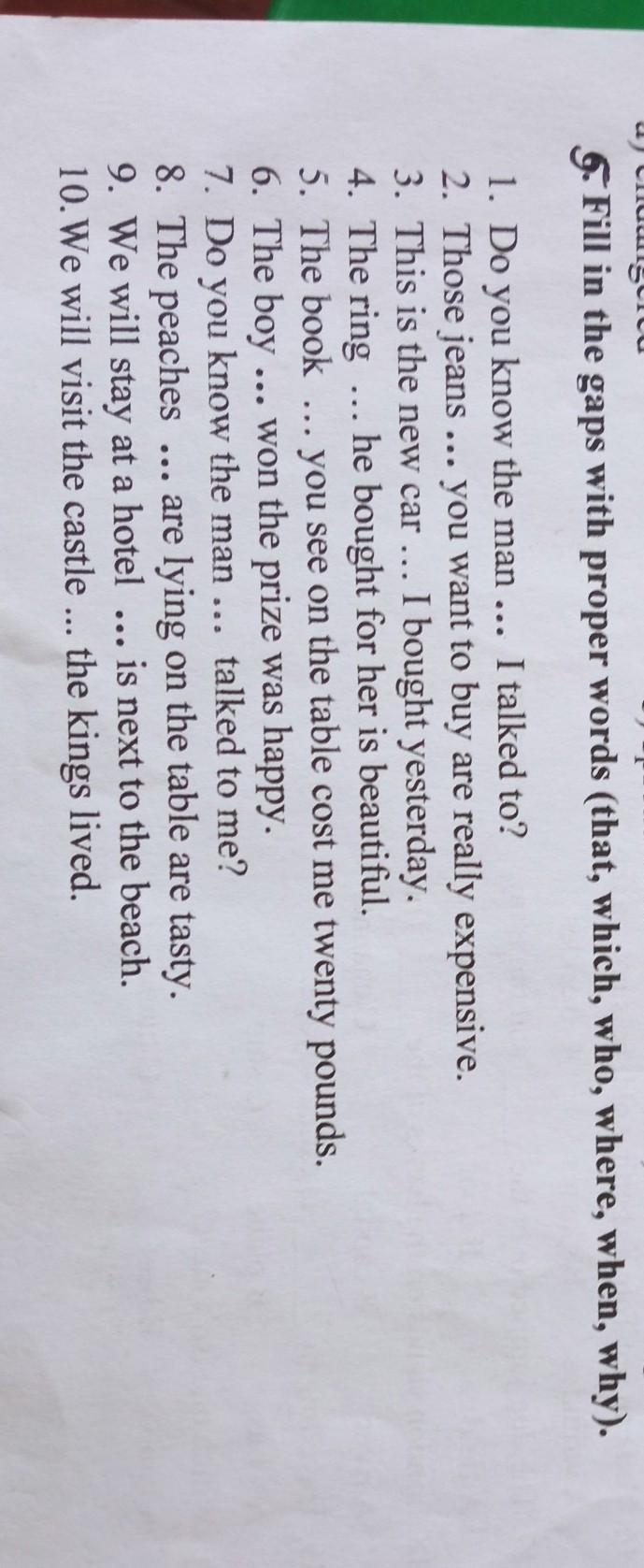 6. Fill in the gaps with proper words (that, which, who, where, when, why). 1. Do you know the man I talked to? 2. Those jeans... you want to buy are really expensive. 3. This is the new car ... I bought yesterday. 4. The ring he bought for her is beautiful. 5. The book ... you see on the table cost me twenty pounds. 6. The boy... won the prize was happy. 7. Do you know the man ... talked to me? 8. The peaches ... are lying on the table are tasty. 9. We will stay at a hotel is next to the beach. 10. We will visit the castle ... the kings lived. ... ... ДОПОМОЖІТЬ БКДЬЛАСКА ДАЮ 90 БПЛІВ