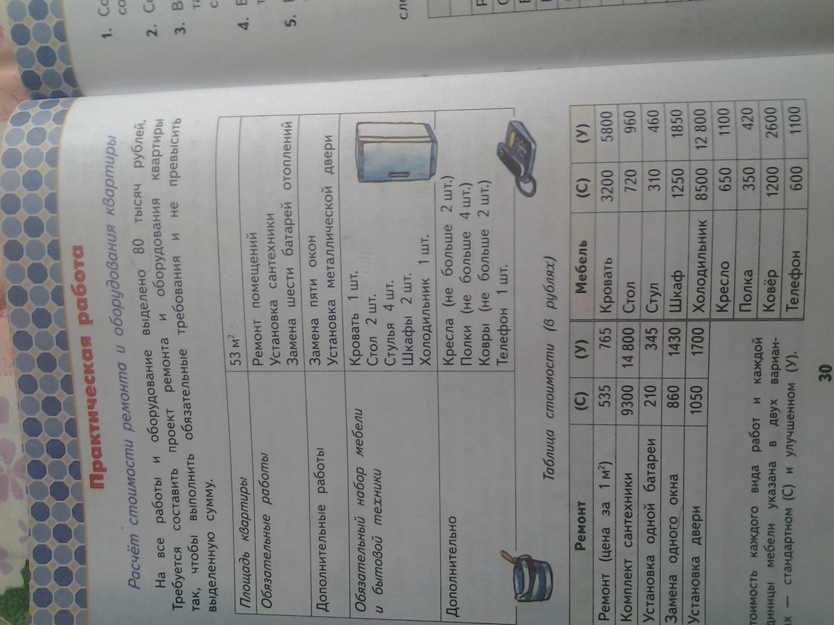 На все работы и оборудования выделено 80000 рублей. Требуется составить проект ремонта и оборудования квартир так, чтобы выполнить обязательные требования и не превысить выделенную сумму