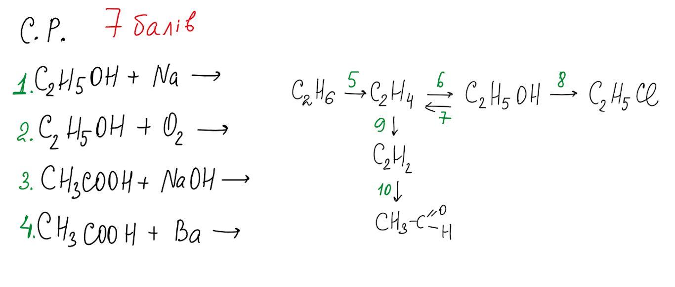 C2H5OH + Na → Це одна реакція заміщення, коли натрій (Na) витісняє водень (H) в етанолі (C2H5OH), що призводить до утворення етоксиду натрію (NaC2H5) і газоподібного водню (H2).