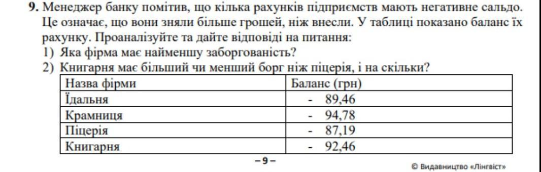 2. Треба відняти баланс книгарні від балансу піцеріїї :