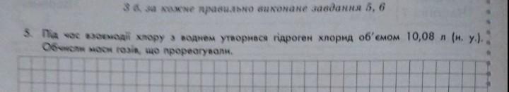 срочно Помогите 5) під час взаємодії хлору з воднем утворився гідроген хлорид 10,08 л Обчисли маси газів що прореогували