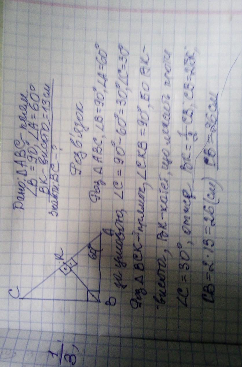 Дано прямокутний трикутник ABC(кут B = 90° ). ВК - висота трикутника. А = 60° а BK = 13CM Знайдіть довжину сторони ВС.