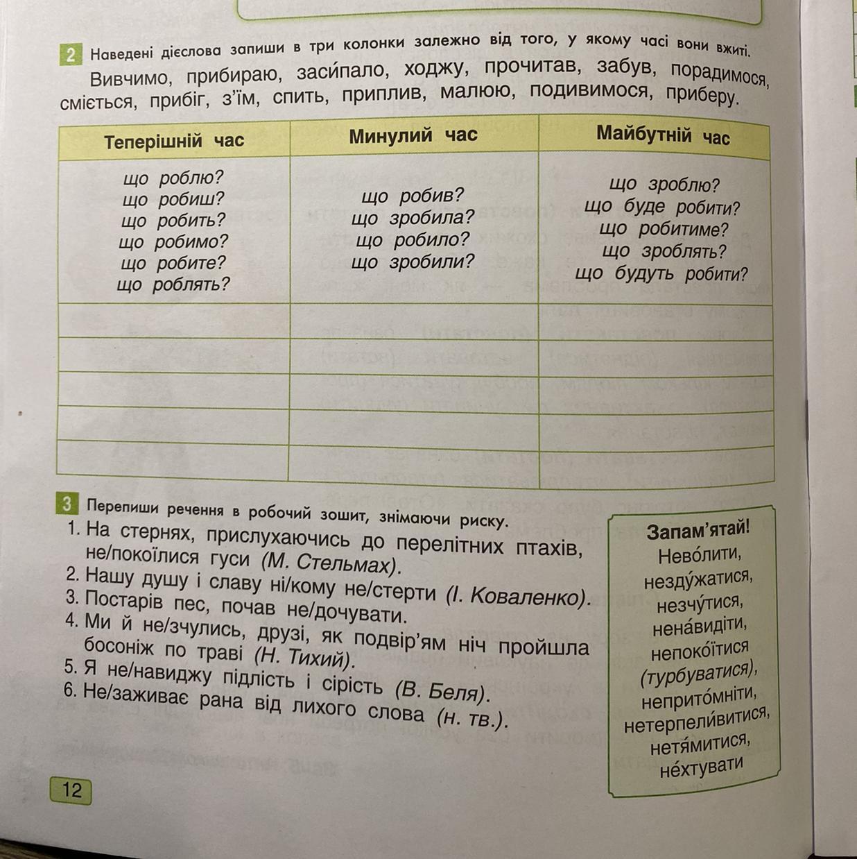 2 Наведені дієслова запиши в три колонки залежно від того, у якому часі вони вжиті.
