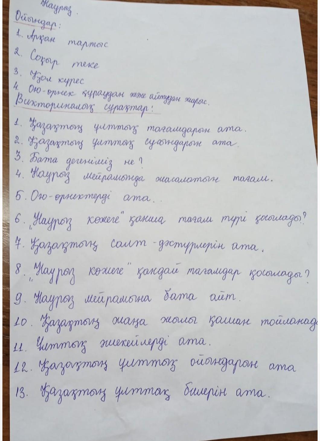 1. Ет тамақ, қамыр ауқат(бешбармақ), қуырдақ, наурыз көже, талқан, сүр ет т.б.