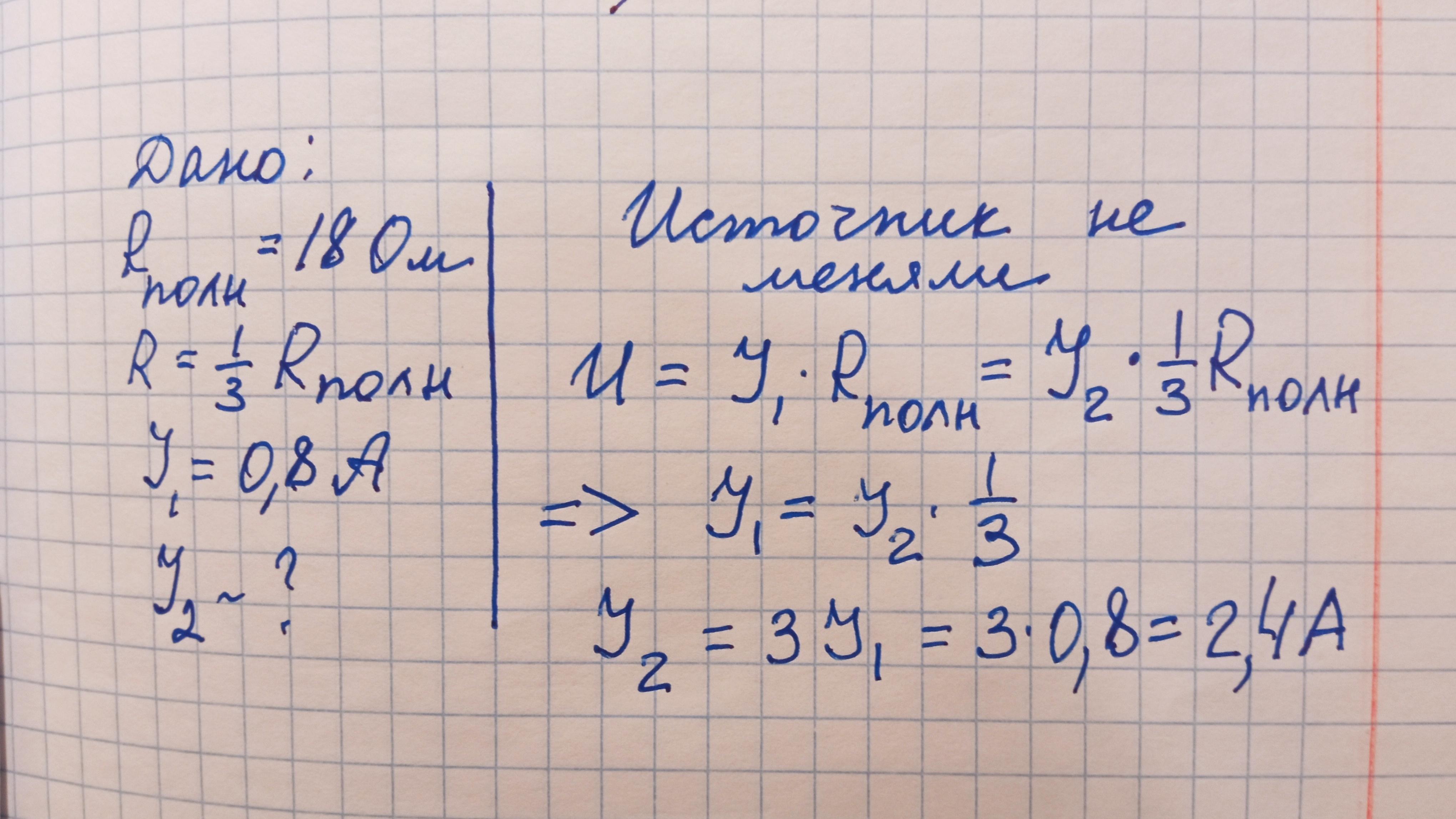 Решаю: при полном включении реостата сила тока 0,8 А. Найти силу тока при включении трети сопротивления реостата.