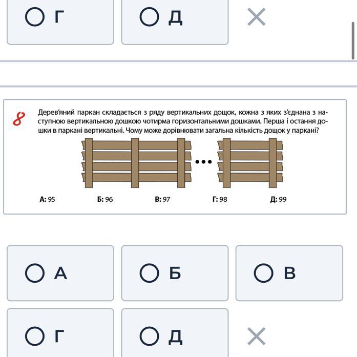 Ответ:В паркані до вертикальної дошки причеплені 4 горизонтальні, всього 5, це як секція. Таких секцій може бути скільки завгодно, але дошок буде кратно п‘яти ; плюс одна крайня вертикальна. Тобто, 96=5х19 + 1