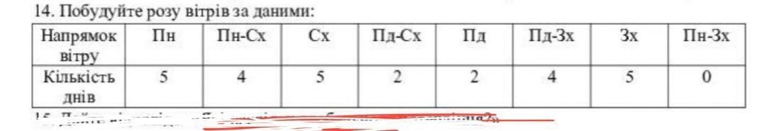 14. Побудуйте розу вітрів за даними: Пн Пн-Сх Cx Напрямок вітру Кількість днів 5 4 5 Пд-Сх 2 Пд 2 ПД-3x 4 3x 5 Пн-3х 0