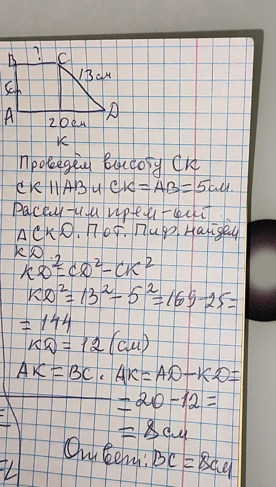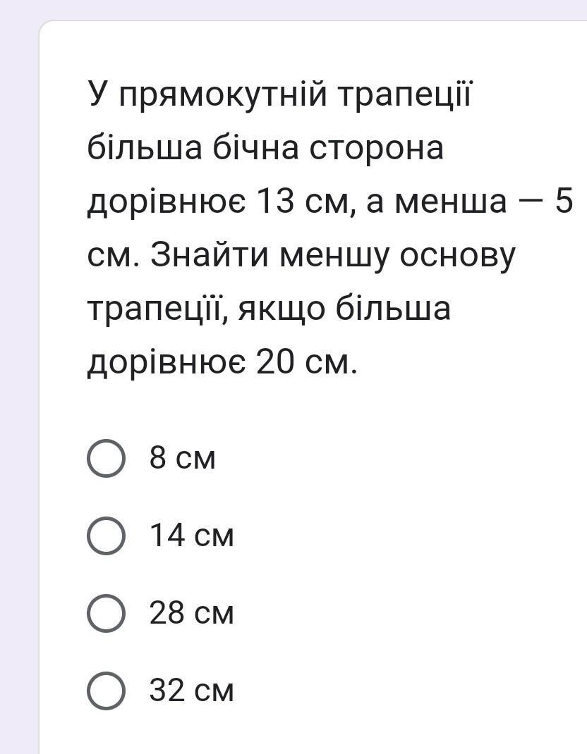 У прямокутній трапеції більша бічна сторона дорівнює 13 см, а менша 5 см. Знайти меншу основу трапеції, якщо більша дорівнює 20 см. -