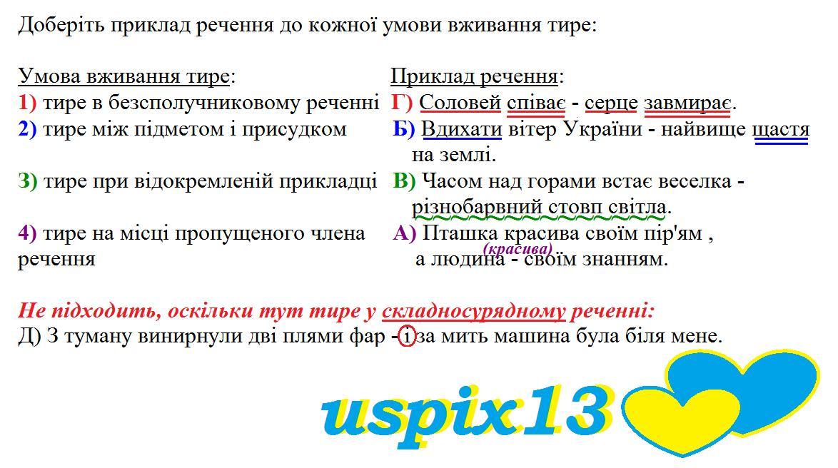 28.Доберіть приклад речення до кожної умови вживання тире: Умова вживання тире:1)тире в безсполучниковому реченнi 2) тире мiж підметом і присудком З)тире при відокремленiй прикладці 4) тире на місці пропущеного члена речення Приклад речення: А) Пташка красива своïм пір'ям , а людина-своïм знанням. Б) Вдихати вітер України - найвище щастя на землi. В) Часом над горами встає веселка-різнобарвний стовп світла. Г)Соловей спiває-серце завмирає. Д) З туману винирнули дві плями фар - i за мить машина була бiля мене.