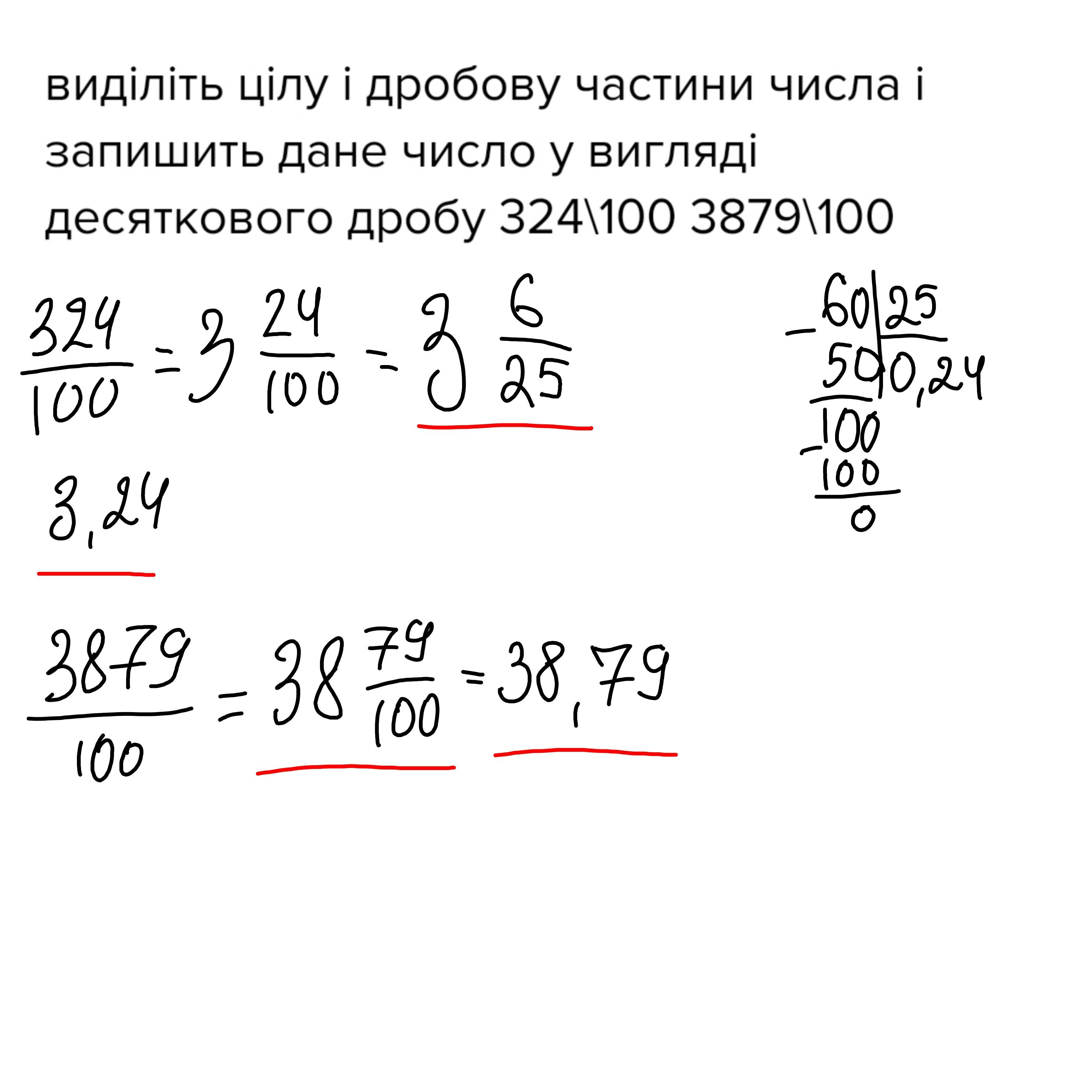 видiлiть цiлу i дробову частини числа i запишить дане число у виглядi десяткового дробу 324\100 3879\100