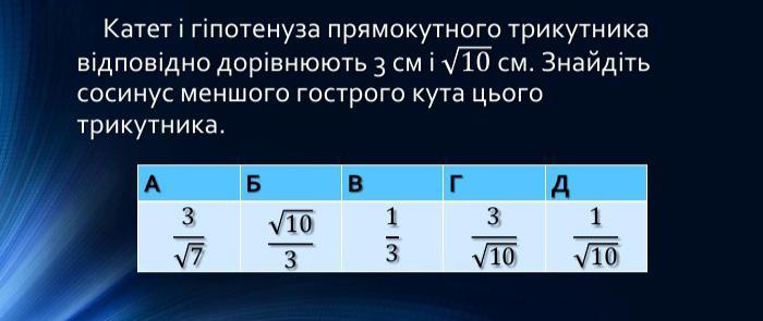 в²=10-9=1, в=1. Менший кут лежить напроти катета в 1 см Тоді сosb=3/ |/10.