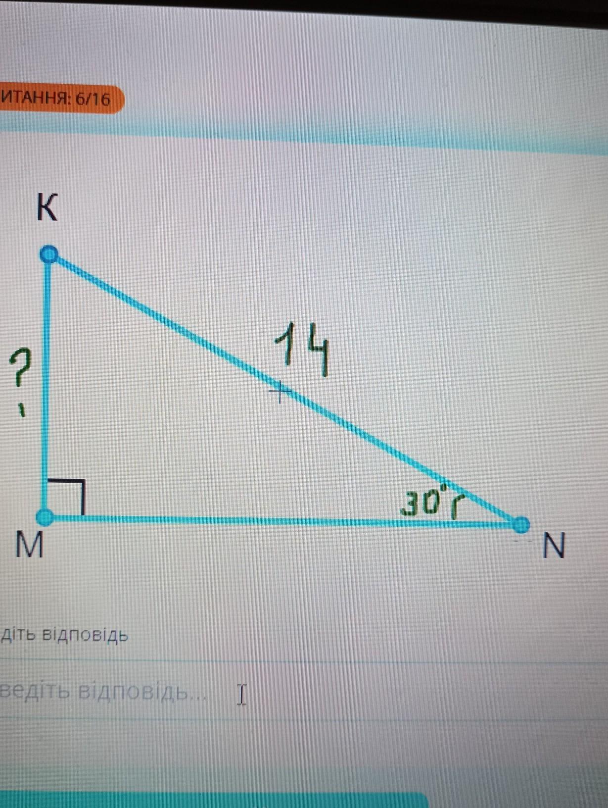 KM лежить навпроти кута 30°, отож ця сторона у два рази менша за гіпотенузу. KM=KN:2=14:2=7....