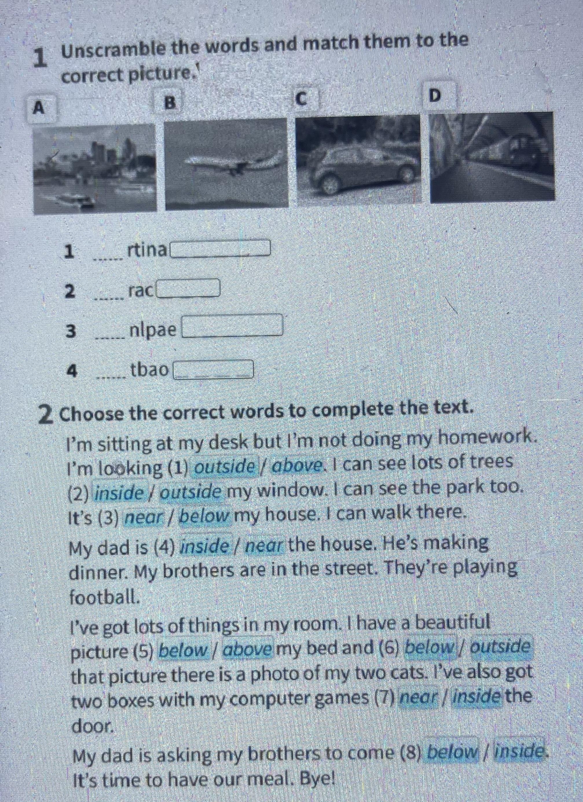 I've got lots of things in my room. I have a beautiful picture (5) below / above my bed and (6) below / outside that picture there is a photo of my two cats. I've also got two boxes with my computer games (7) near / inside the door.