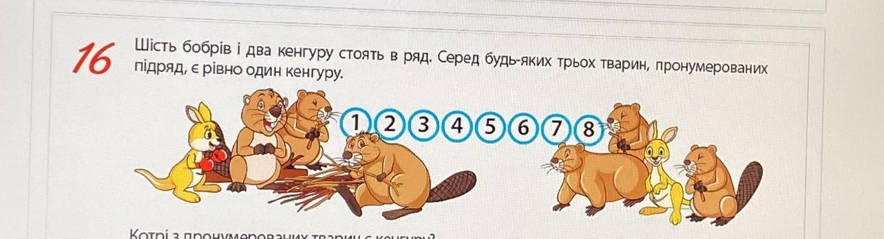 Шість бобрів і два кенгуру стоять в ряд. Серед будь-яких трьох тварин, пронумерованих 16 підряд, є рівно один кенгуру.