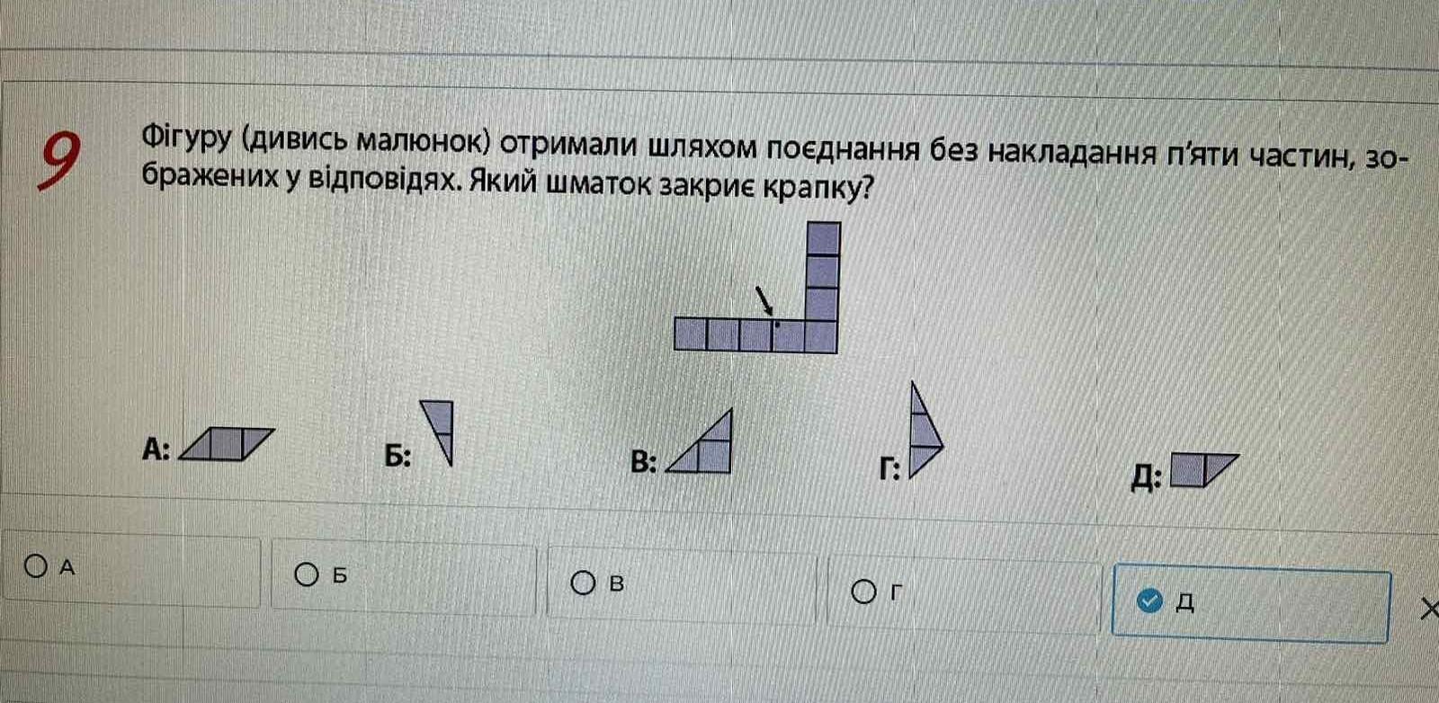 Фігуру (дивись малюнок) отримали шляхом поєднання без накладання п'яти частин, зо- бражених у відповідях. Який шматок закриє крапку?