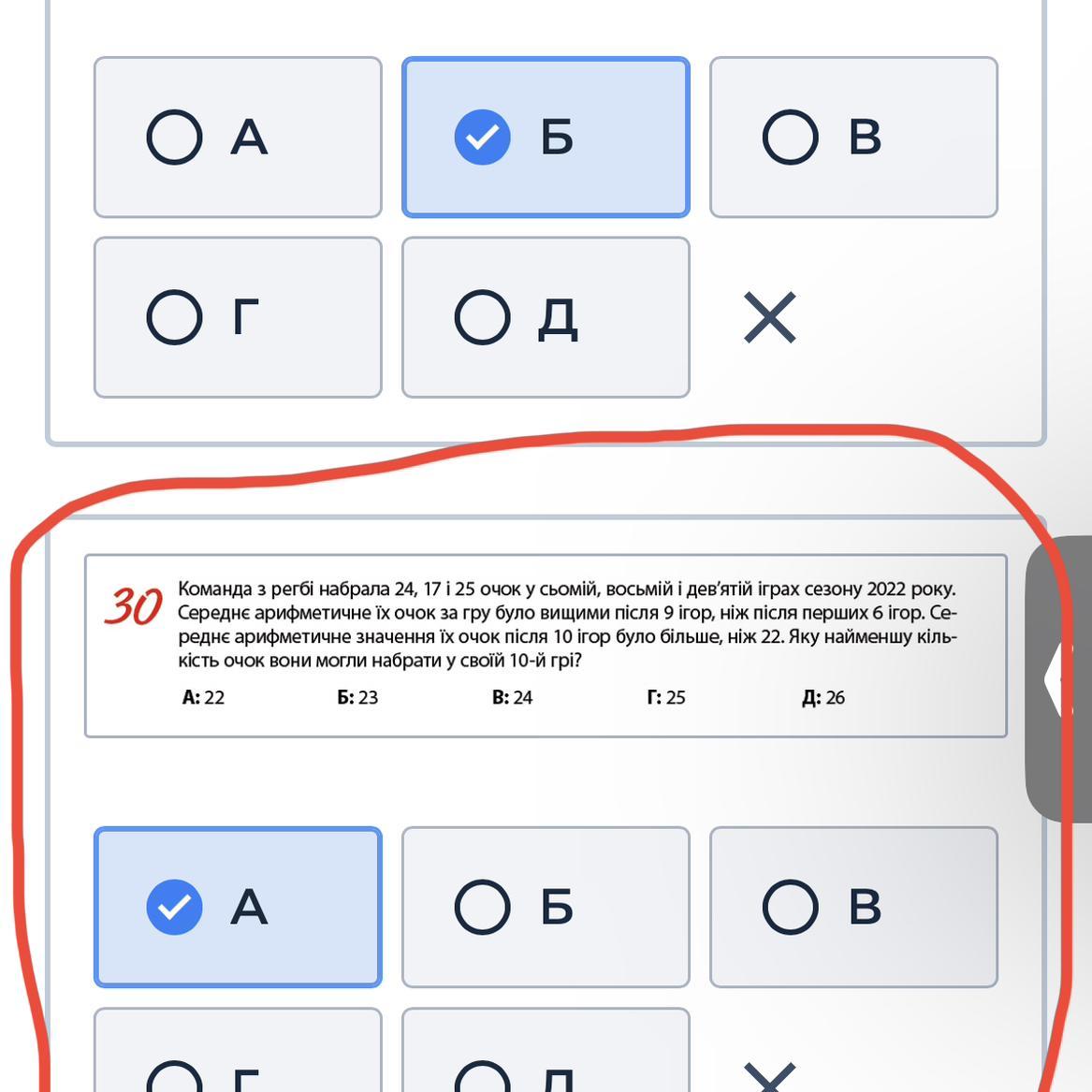30 Середнє арифметичне їх очок за гру було вищими після 9 ігор, ніж після перших 6 ігор. Се- реднє арифметичне значення їх очок після 10 ігор було більше, ніж 22. Яку найменшу кіль-