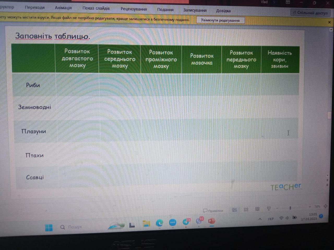 Птахи: розвиток довгастого мозку - значний, розвиток середнього мозку - значний, розвиток проміжного мозку - значний, розвиток мозочка - значний, розвиток переднього мозку - значний, наявність кори, звивин - є.