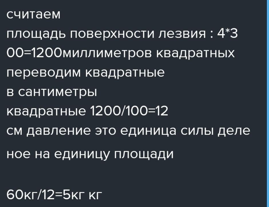 Площадь поверхность лезвия: 4*300=200 міліметрів квадратних переводим квадратные в сантиметри квадраные 1200/100=12см давленые это единица силы деленое на единицу площади