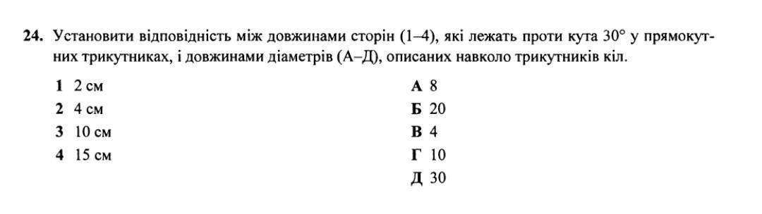 Установити вiдповiднiсть мiж довжинами сторін (1-4), які лежать проти кута 30° у прямокут- них трикутниках, і довжинами діаметрів (А-Д), описаних навколо трикутників кіл. 1 2 cм 2 4 см 3 10 см 4 15 см A 8 Б 20 В 4 Г 10 д 30