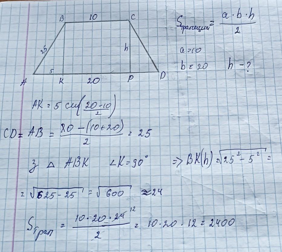 Найдите площадь равнобокой трапеции, основания которой равны 10 см и 20 см, а периметр равен 80 см.