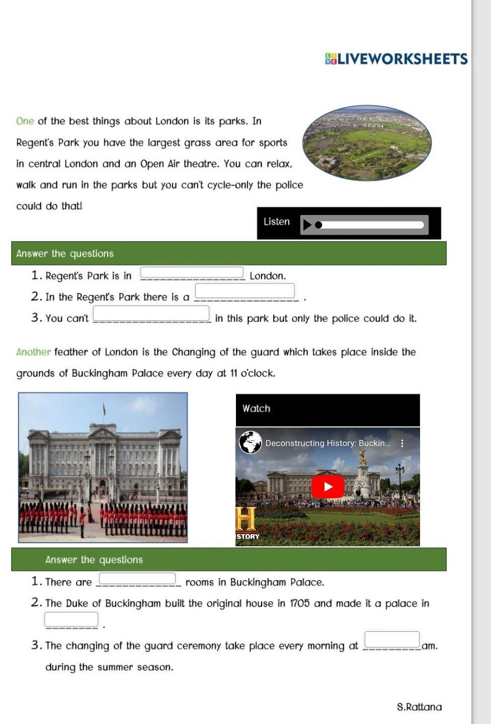 One of the best things about London is its parks. In Regent's Park you have the largest grass area for sports in central London and an Open Air theatre. You can relax, walk and run in the parks but you can't cycle-only the police I could do that! Answer the questions 1. Regent's Park is in 2. In the Regent's Park there is a 3. You can't FFFFEE Answer the questions London. Another feather of London is the Changing of the guard which takes place inside the grounds of Buckingham Palace every day at 11 o'clock. Listen in this park but only the police could do it. Watch H STORY Deconstructing History: Buckin... : Foror No 1. There are rooms in Buckingham Palace. 2. The Duke of Buckingham built the original house in 1705 and made it a palace in 3. The changing of the guard ceremony take place every morning at during the summer season. am.
