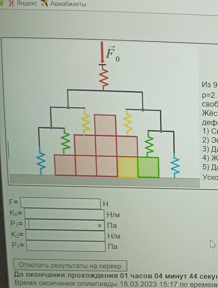 Из 9 одинаковых кубиков со стороной а=7.8 см сложили пирамидку на твердой подставке. Плотность материала кубиков p=21 г/см². Сверху на кубики и на подставку опираются невесомые пружины, скрепленные невесомыми стержнями со свободно вращающимися шарнирами в точках крепления. Плечи у рычагов, к которым крепятся пружины, одинаковы Жесткость самой верхней (красной) пружины k=370 Н/м. Сверху к конструкции приложили силу Fo=186 H. Величина деформации у каждой из пружин оказалась одинаковой. Определите: 1) Силу F, действующую на подставку со стороны нижней (голубой) пружины. 2) Эквивалентную жёсткость к конструкции. ww 3) Давление Р., которое зелёный кубик оказывает на стол. 4) Жесткость к желтой пружины. 5) Давление ру, которое жёлтый кубик оказывает на стол. Ускорение свободного падения примите равным 9.8м/с². Ответы вводите с точностью не хуже 0.1%