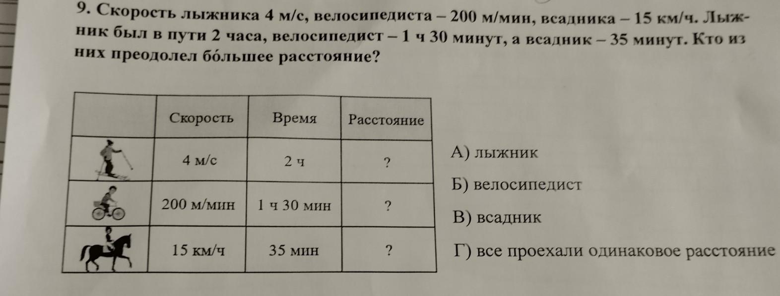 9. Скорость лыжника 4 м/с, велосипедиста - 200 м/мин, всадника - 15 км/ч. Лыж- вик был в пути 2 часа, велосипедист - 1 ч 30 минут, а всадник них преодолел большее расстояние? 35 минут. Кто из т Скорость 4 м/с 200 м/мин 15 км/ч Время 2 ч 1 ч 30 мин 35 мин Расстояние 2 ? А) лыжник Б) велосипедист В) всадник Г) все проехали одинаковое расстояние?