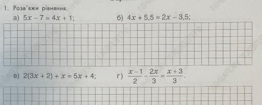 ● 1. Розв'яжи рiвняння. a) 5x - 7 = 4x + 1; в) 2(3x + 2) + x = 5x + 4; 6) 4x + 5,5 = 2x - 3,5; г) x-1 2x 2 3 x+3 3 IIAWV aтні ооочееенннньь срооооччнноо даю 50 балов