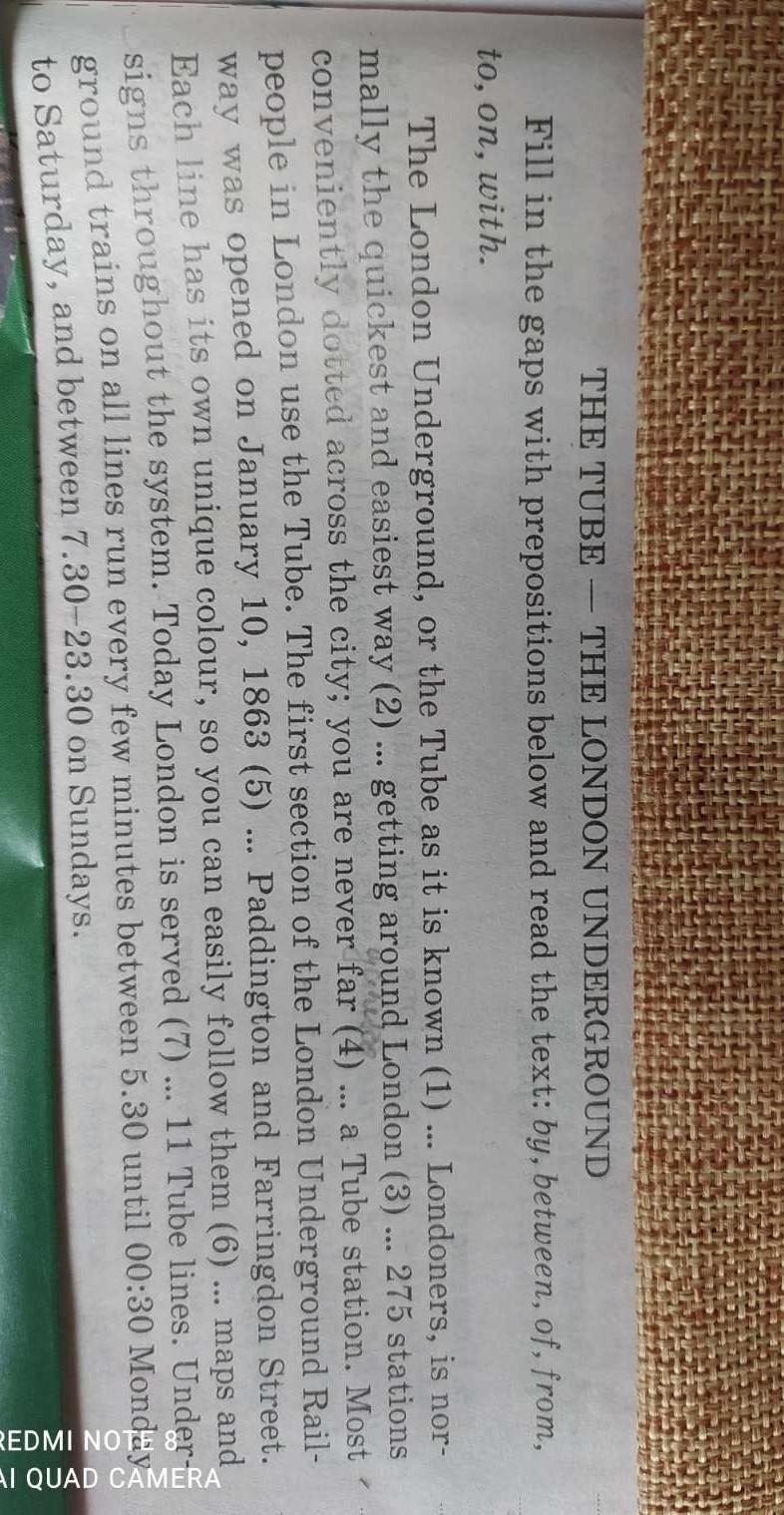 The London Underground, or the Tube as it is known (1) to Londoners, is normally the quickest and easiest way (2) of getting around London (3) with 275 stations conveniently dotted across the city; you are never far (4) from a Tube station. Most people in London use the Tube. The first section of the London Underground Railway was opened on January 10, 1863 (5) between Paddington and Farringdon Street. Each line has its own unique colour, so you can easily follow them (6) on maps and signs throughout the system. Today London is served (7) by 11 Tube lines. Underground trains on all lines run every few minutes between 5.30 until 00:30 Monday to Saturday, and between 7.30-23.30 on Sundays.