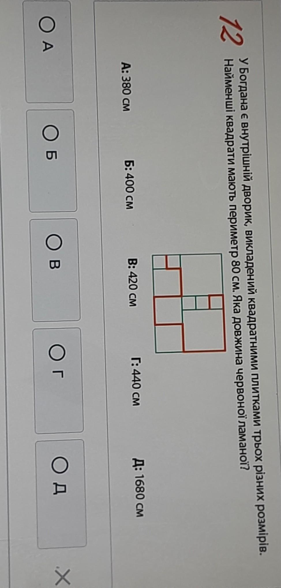 У Богдана є внутрішній дворик, викладений квадратними плитками трьох рiзних розмірів. 12 найменш квадрати мають периметр во см, яка довжина червоної ламаної.
